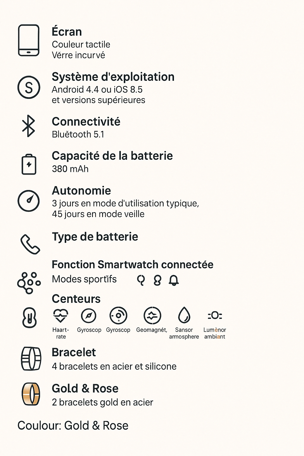 4 Ceintures : Acier Gold, 3 Silicone Rose + 2 Bracelets gold