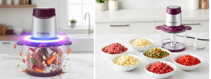 تحتوي المفرمة على 4 شفرات حادة من الفولاذ المقاوم للصدأ لضمان تقطيع مثالي وسريع لمختلف المكونات — سواء كانت لحومًا، خضروات أو أعشاب 🌿.